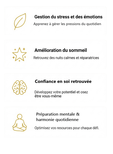 Des séances adaptées à votre rythme et à vos besoins uniques pour un mieux-être optimal.